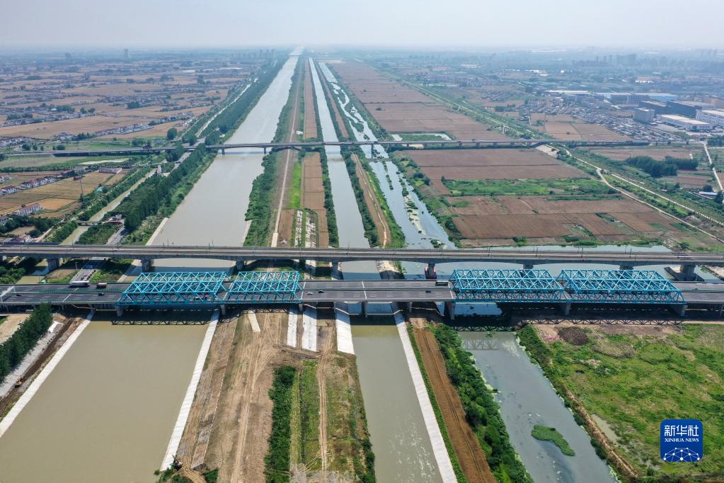 京滬高速公路擴建工程蘇北灌溉總渠大橋現場(chǎng)(6月6日攝,無(wú)人機照片)。