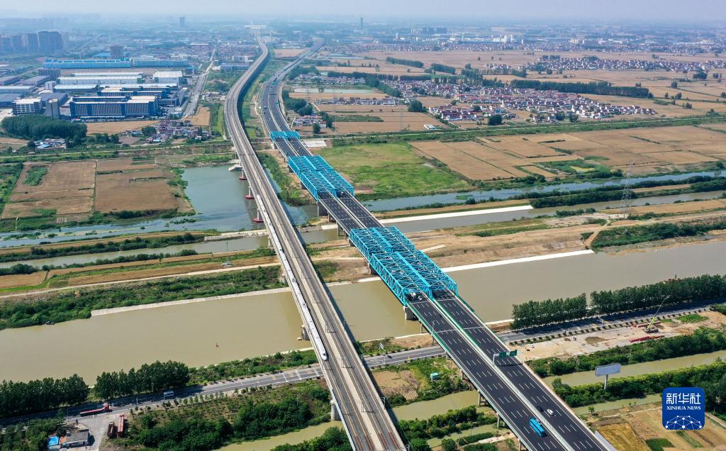 京滬高速公路擴建工程蘇北灌溉總渠大橋現場(chǎng)(6月6日攝,無(wú)人機照片)。