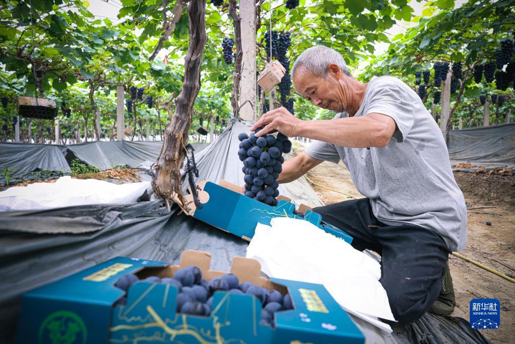 6月8日,村民將采摘的葡萄裝箱,準備銷(xiāo)售。