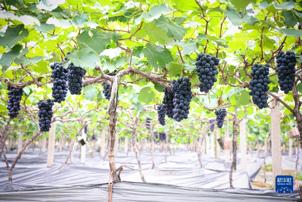 江北區曙波果蔬農場(chǎng)大棚內的葡萄藤上掛滿(mǎn)了顆粒飽滿(mǎn)的葡萄果實(shí)(6月8日攝)。