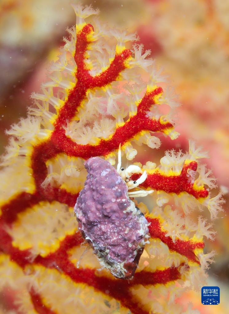 在分界洲島附近海域,一只寄居蟹在珊瑚上爬行(5月25日攝)。
