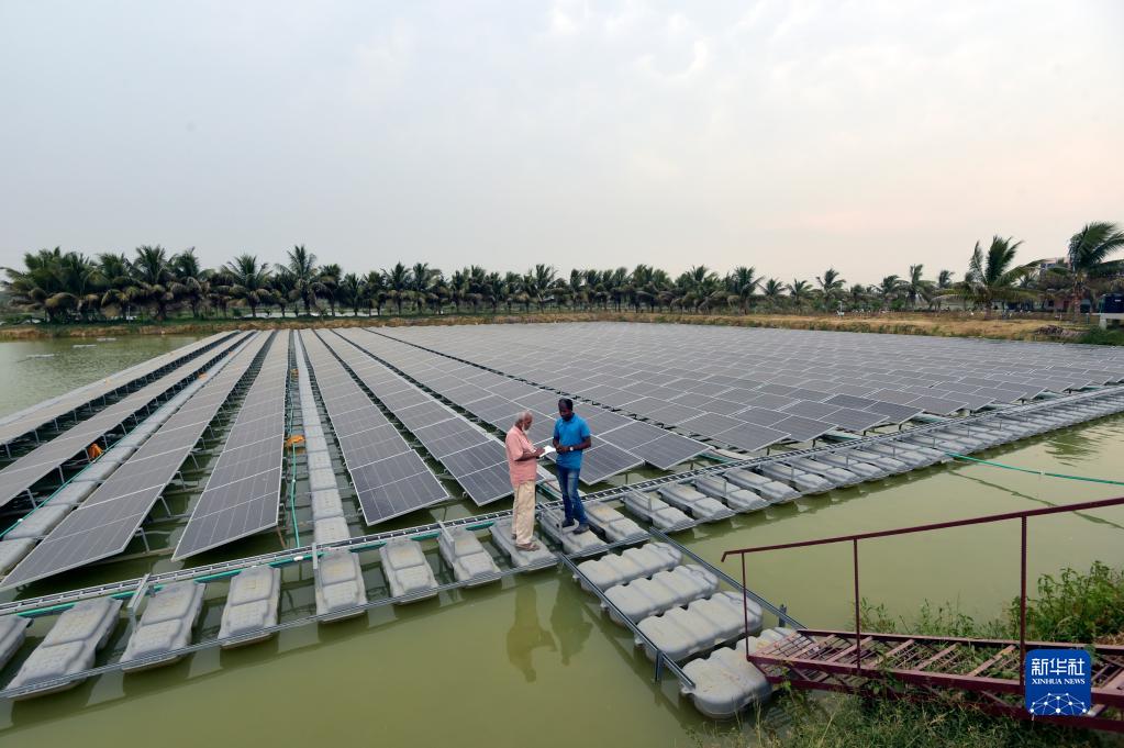 6月5日,在孟加拉國查帕伊諾瓦布甘杰,工作人員檢查水上漂浮太陽(yáng)能光伏發(fā)電站運行情況。