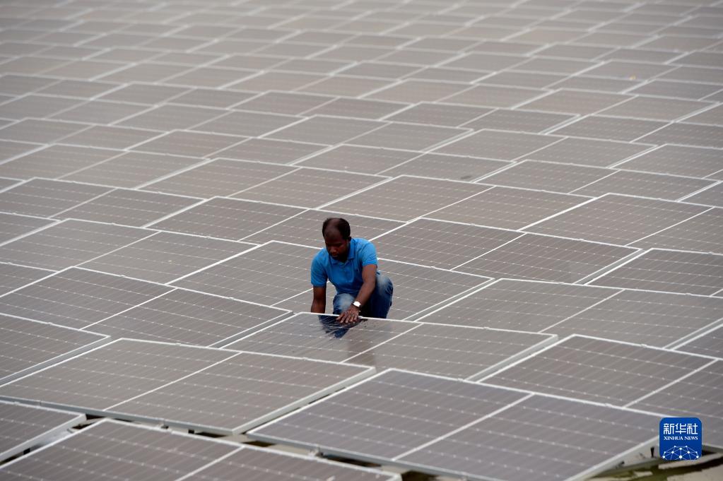 6月5日,在孟加拉國查帕伊諾瓦布甘杰,工作人員檢查水上漂浮太陽(yáng)能光伏發(fā)電站運行情況。