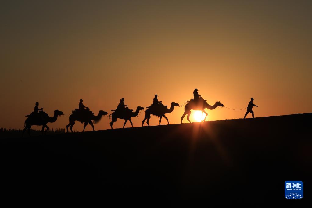 6月7日清晨,在甘肅敦煌鳴沙山月牙泉景區,游客騎乘駱駝感受大漠風(fēng)光。