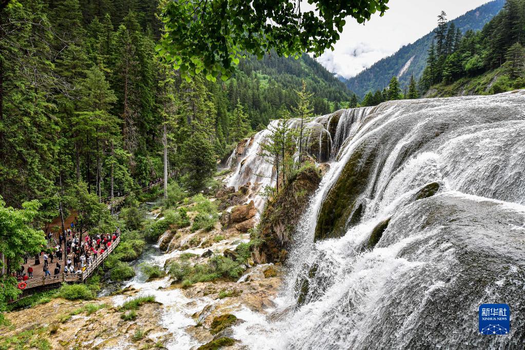 游客在九寨溝景區珍珠灘瀑布前駐足(6月7日攝)。
