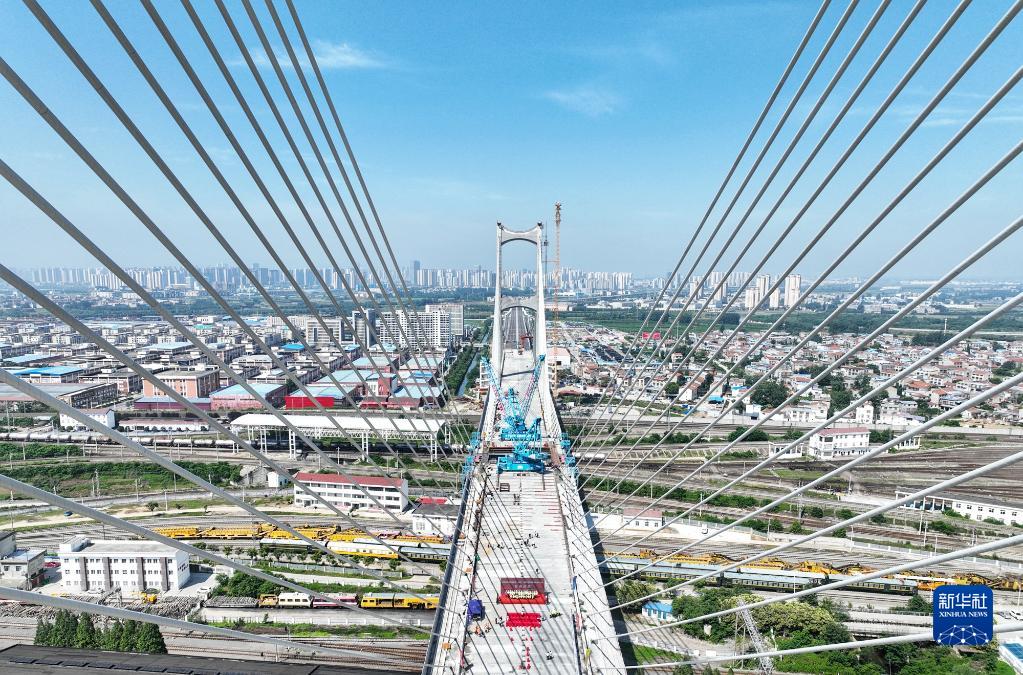 6月8日,中鐵十一局施工機械將襄陽(yáng)北編組站大橋的最后一段鋼主梁吊裝到位。