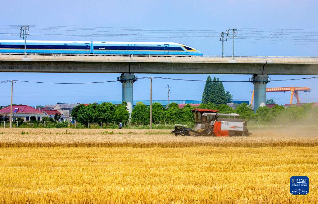 6月8日,在江蘇省揚州市江都區邵伯鎮艾菱村,農民駕駛收割機收割小麥。