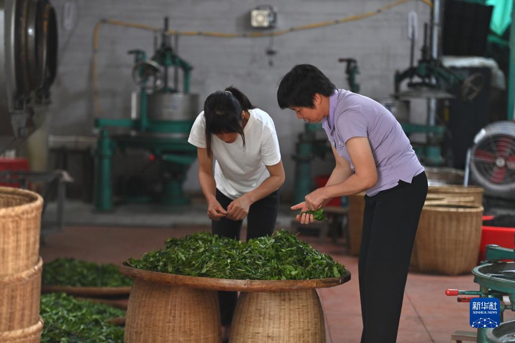 6月7日,在蒼梧縣六堡鎮山坪村,祝雪蘭(右)在制茶。
