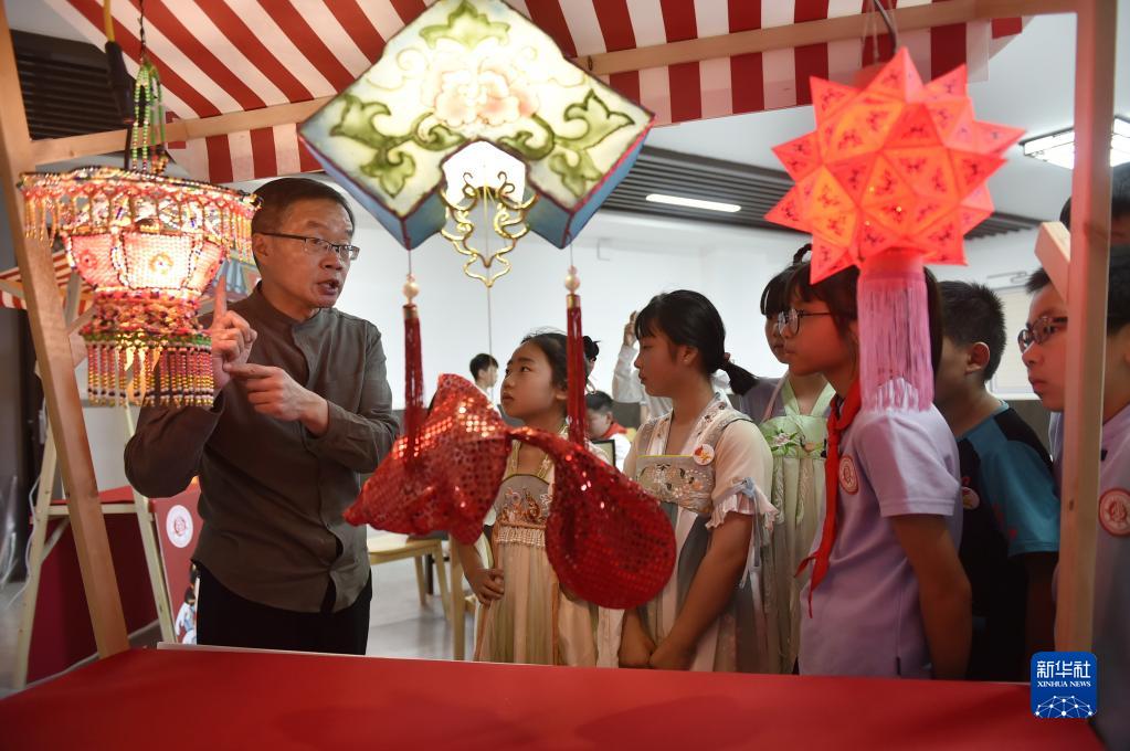 6月8日,學(xué)生們在活動(dòng)現場(chǎng)觀(guān)賞非遺項目“汴京燈籠張”的彩燈作品。