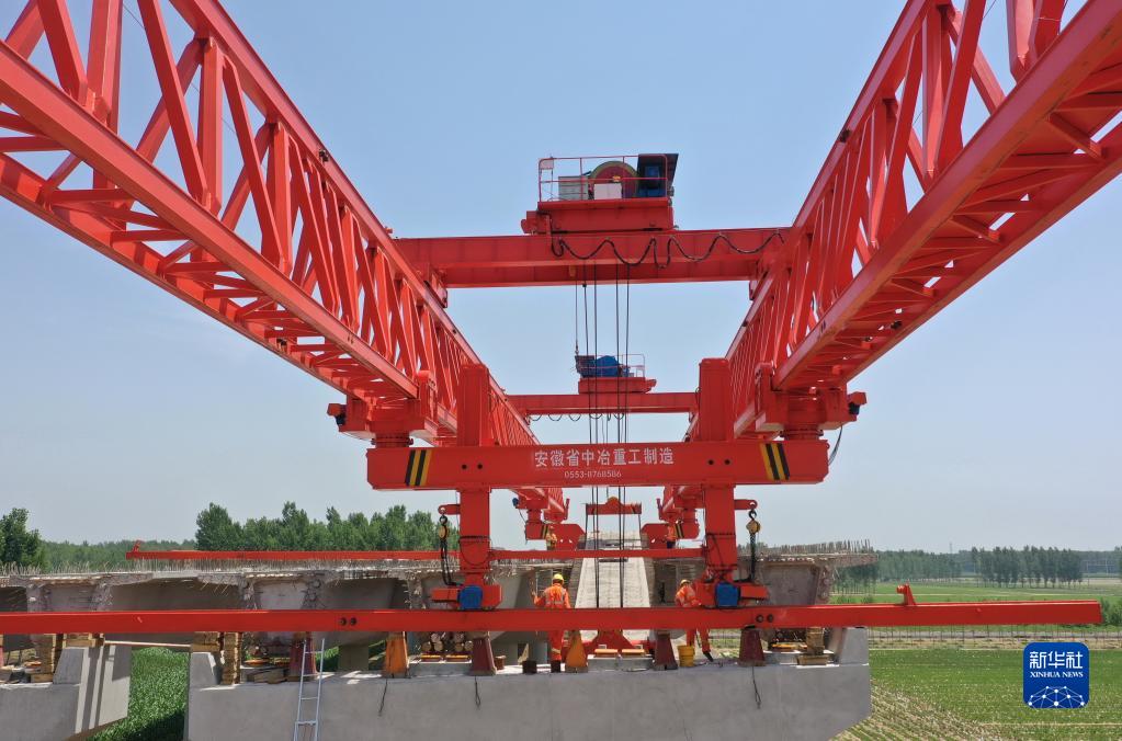 6月8日,工人在河北省昌黎縣境內的秦唐高速三標段建設工地施工(無(wú)人機照片)。