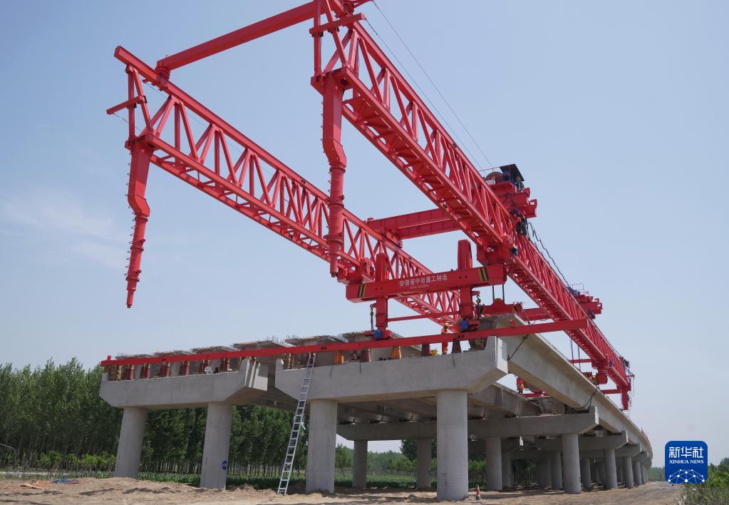 6月8日,工人在河北省昌黎縣境內的秦唐高速三標段建設工地施工(無(wú)人機照片)。