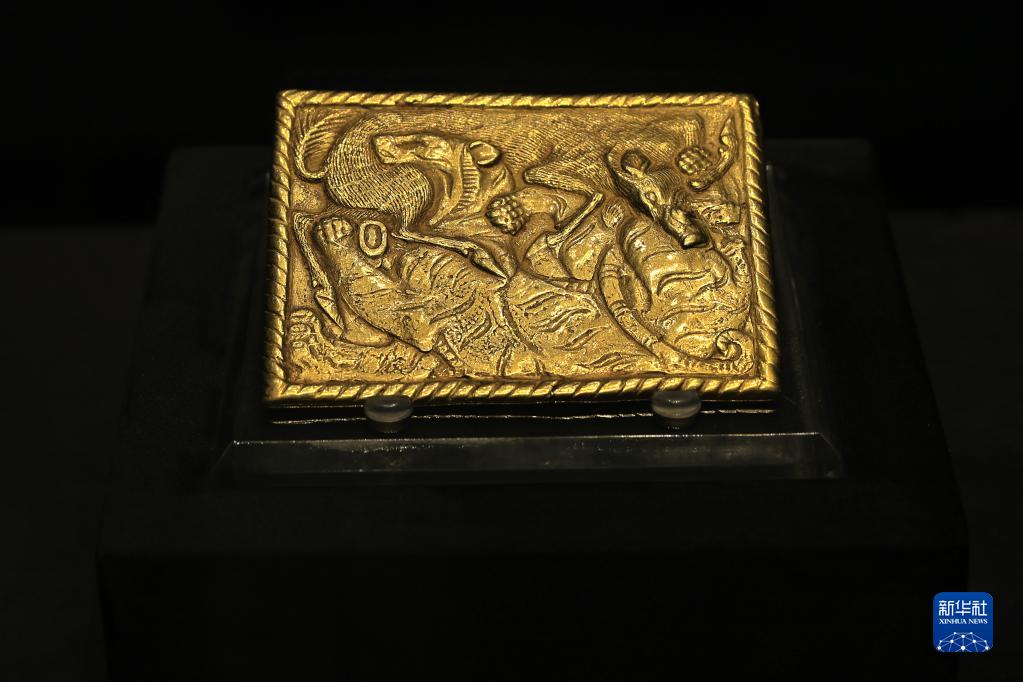 6月9日在“鄂爾多斯青銅器文物精品展”拍攝的展品“虎豕咬斗紋金飾牌”。