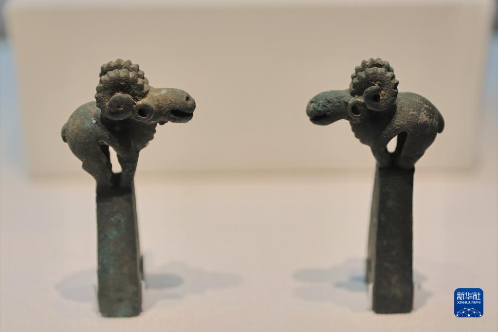 6月9日在“鄂爾多斯青銅器文物精品展”拍攝的展品“盤(pán)角羊形青銅桿頭飾”。
