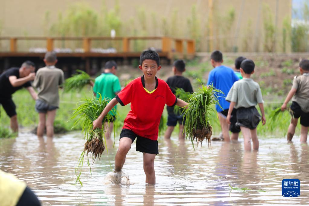 6月9日,學(xué)生在貴州省綏陽(yáng)縣中小學(xué)勞動(dòng)教育綜合實(shí)踐基地體驗插秧。