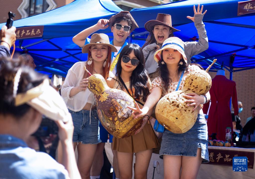 6月9日,在烏魯木齊大巴扎景區,幾位來(lái)自武漢的游客手持葫蘆雕刻作品合影留念。