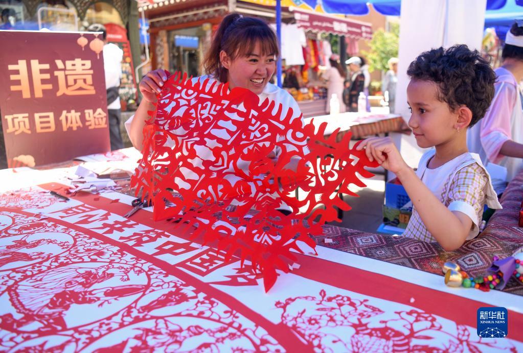 6月9日,在烏魯木齊大巴扎景區,一名小朋友在活動(dòng)現場(chǎng)體驗剪紙。