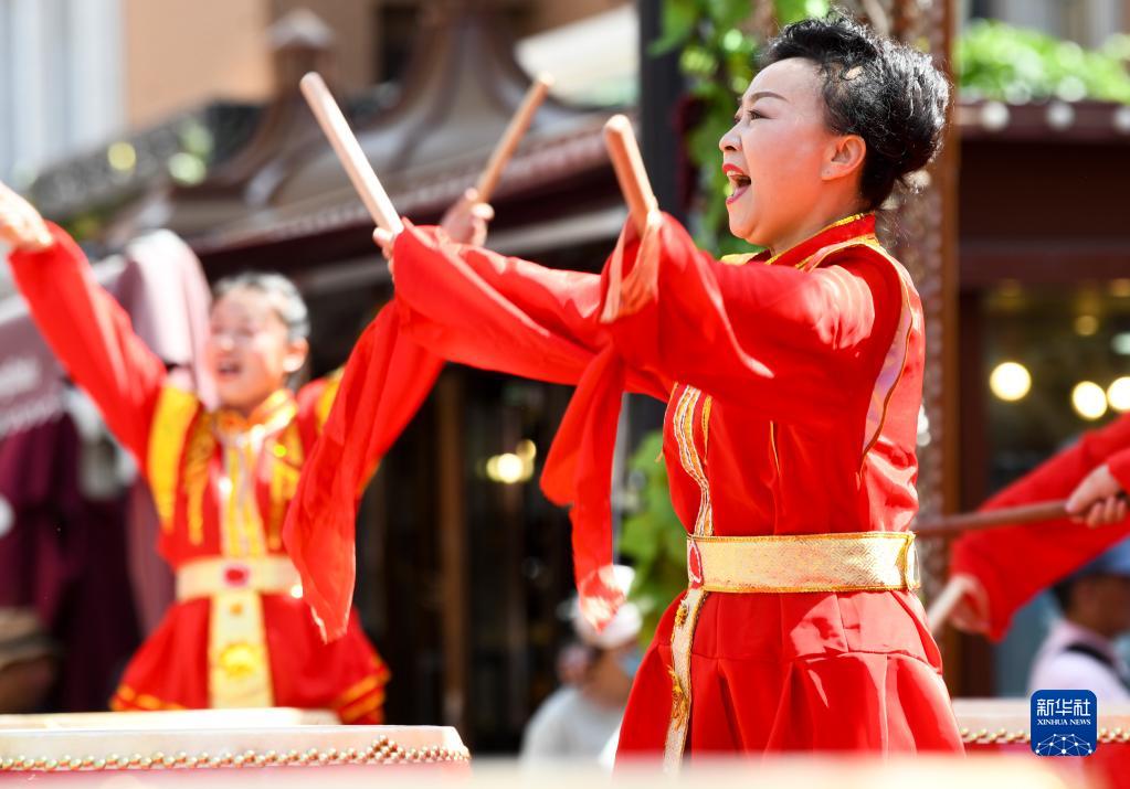6月9日,在烏魯木齊大巴扎景區,烏魯木齊市米東區三道壩鎮社火隊演員在活動(dòng)現場(chǎng)表演。