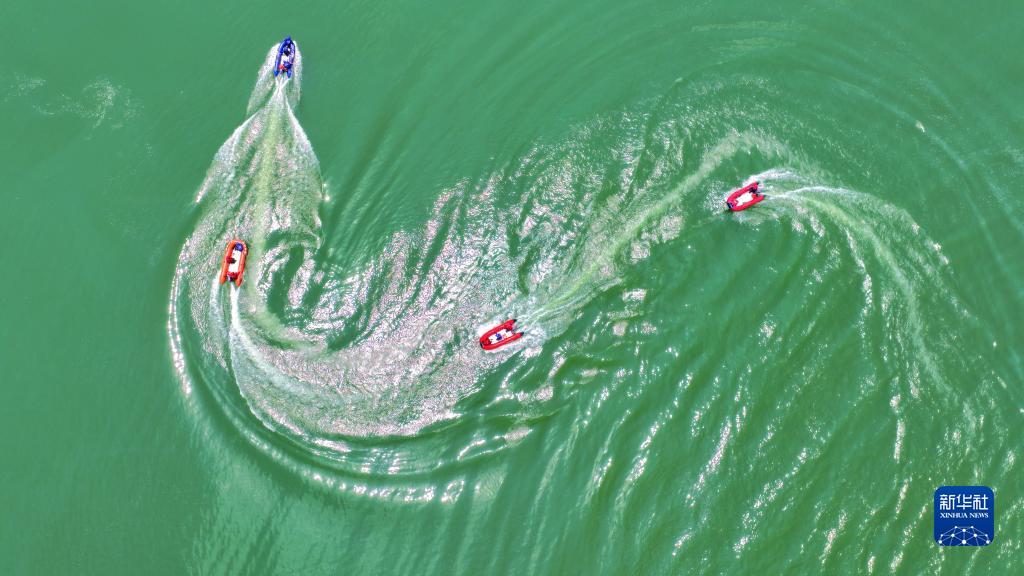 6月9日,在浙江省湖州市長(cháng)興縣合溪水庫煤山段,應急救援隊進(jìn)行沖鋒舟編隊演練(無(wú)人機照片)。