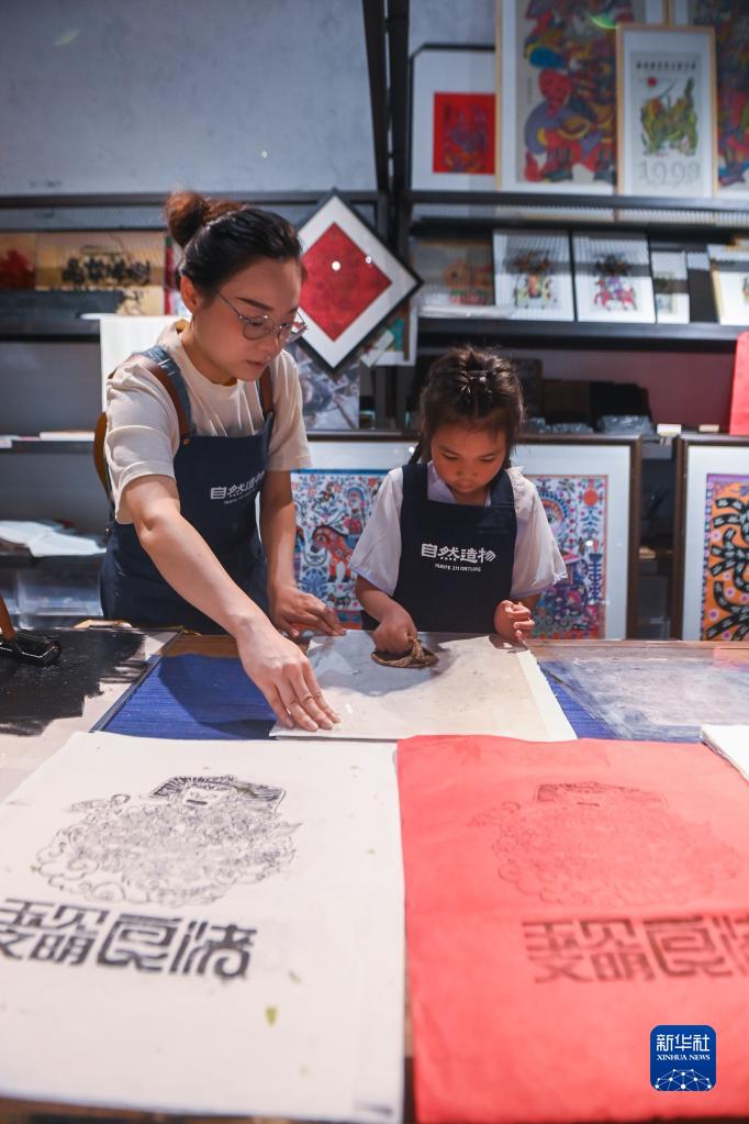 在位于杭州瓶窯老街的自然造物民藝研究中心內,工作人員帶著(zhù)孩子們在體驗木版年畫(huà)拓印技藝(5月28日攝)。該中心是占地3500多平方米的民間手工藝文化空間,集中展示來(lái)自全國二十多個(gè)省份數千種手工藝產(chǎn)品。顧客也可以在這里體驗包括木版年畫(huà)拓印、泥塑彩繪、油紙傘制作、竹編燈籠、刺繡等非遺技藝。