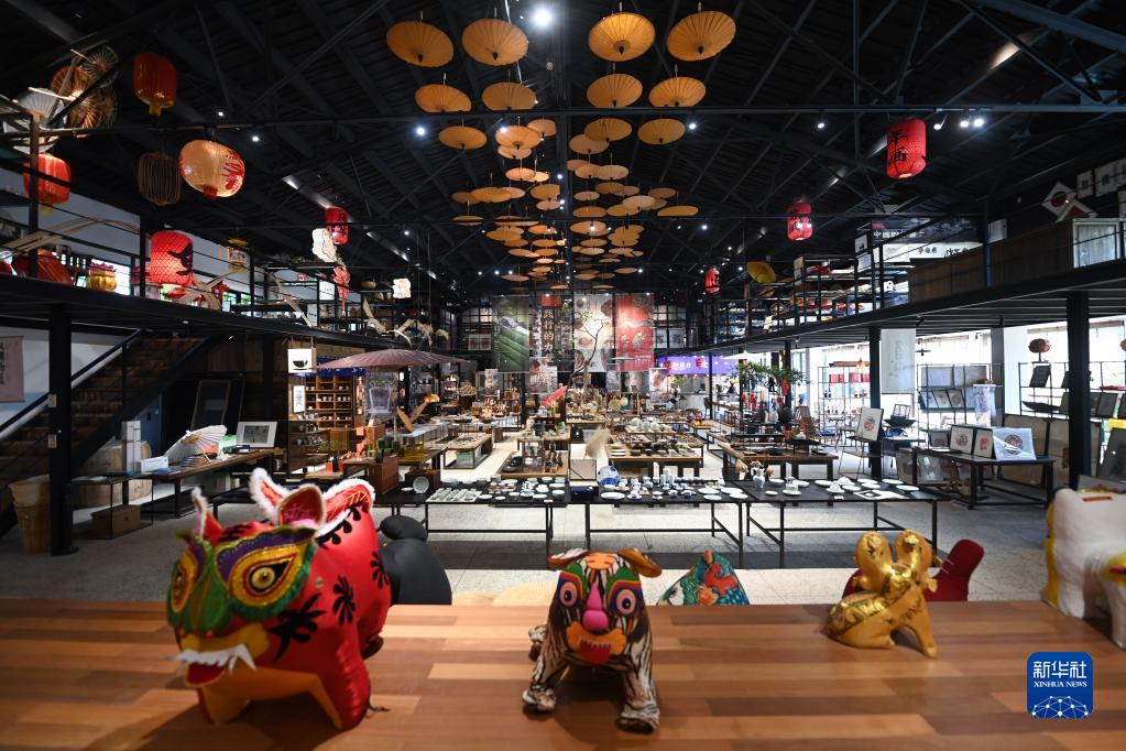 杭州瓶窯老街的自然造物民藝研究中心作為占地3500多平方米的民間手工藝文化空間,集中展示來(lái)自全國二十多個(gè)省份數千種手工藝產(chǎn)品。顧客也可以在這里體驗包括木版年畫(huà)拓印、泥塑彩繪、油紙傘制作、竹編燈籠、刺繡等非遺技藝(5月28日攝)。