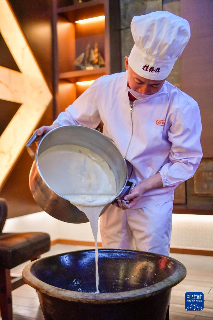 在天津桂發(fā)祥十八街麻花文化館,趙寶陽(yáng)在備料和面,準備手工制作麻花(6月8日攝)。