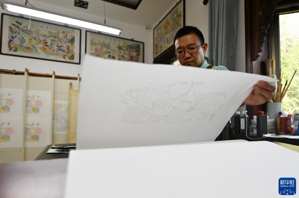 霍樹(shù)林在天津市西青區的楊柳青霍氏古一張畫(huà)店印畫(huà)(6月6日攝)。