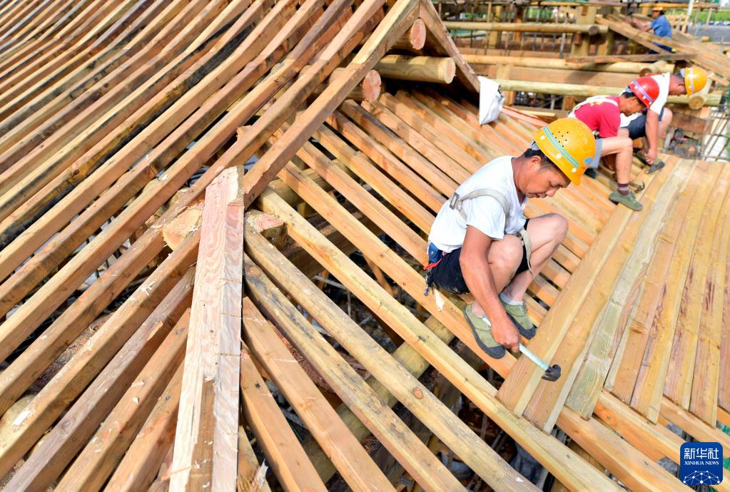 6月10日,木匠在湖北省宣恩縣城仙山貢水旅游區修建景觀(guān)吊腳樓。