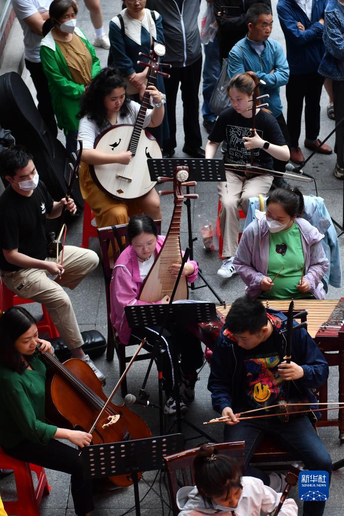 6月5日,長(cháng)沙市花鼓戲保護傳承中心的樂(lè )隊在長(cháng)沙市坡子街火宮殿演出。