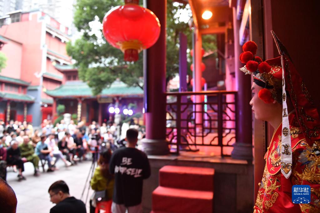 6月5日,在長(cháng)沙市坡子街火宮殿,長(cháng)沙市花鼓戲保護傳承中心的演員在舞臺候場(chǎng)。