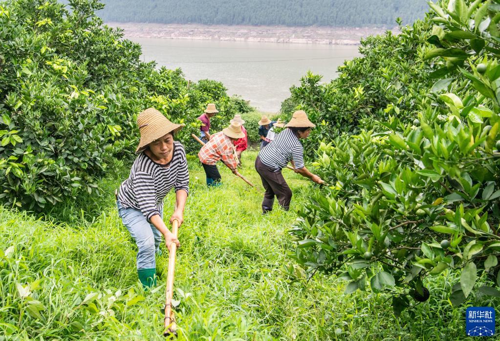 6月7日,在位于重慶市云陽(yáng)縣云陽(yáng)鎮蔬菜村的柑橘產(chǎn)業(yè)示范園,農戶(hù)在田里勞作。該項目由村集體與企業(yè)合作經(jīng)營(yíng),通過(guò)流轉土地、吸納勞動(dòng)力務(wù)工、與農戶(hù)建立利益聯(lián)結等方式,帶動(dòng)農戶(hù)實(shí)現增收。