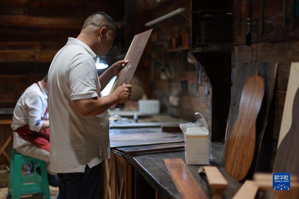 工作人員在正安吉他產(chǎn)業(yè)園內制作吉他(6月7日攝)。