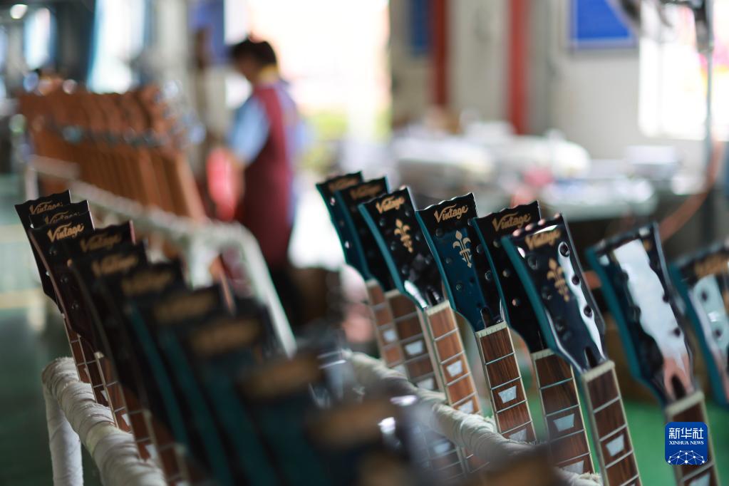 工作人員在正安吉他產(chǎn)業(yè)園內制作吉他(6月7日攝)。