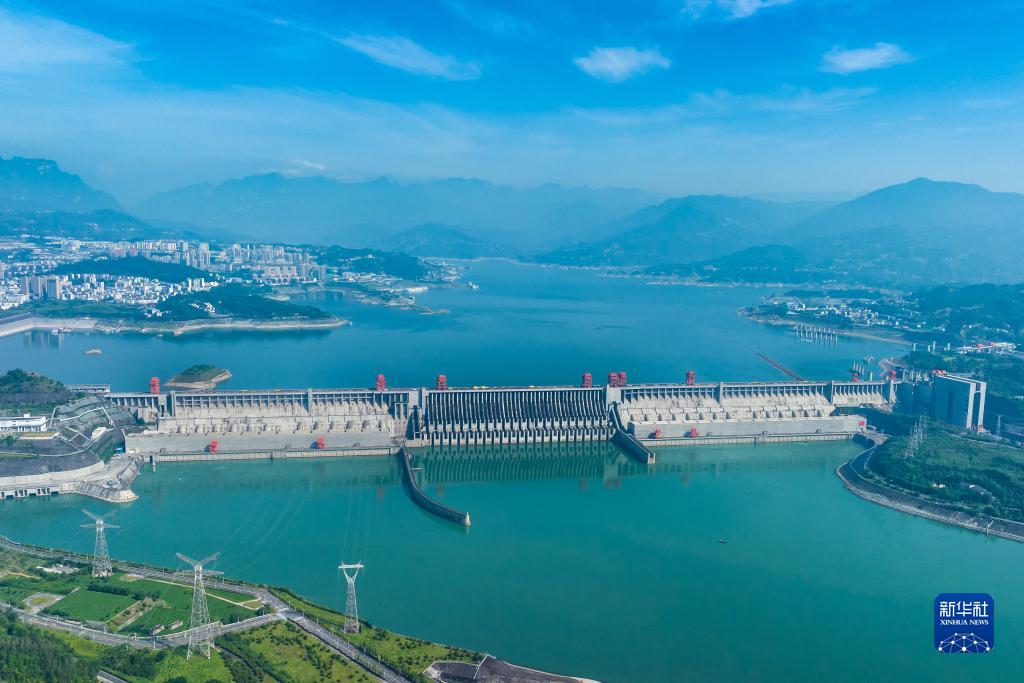 6月10日在湖北省宜昌市秭歸縣拍攝的三峽水庫水位下降后的三峽大壩(無(wú)人機照片)。