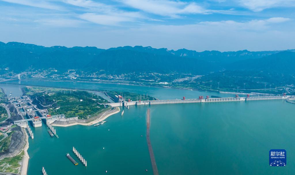 6月10日,船舶有序通過(guò)三峽雙線(xiàn)五級船閘(無(wú)人機照片)。