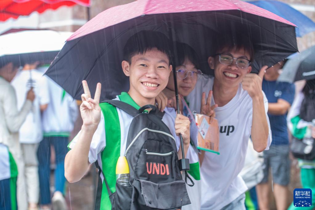 6月10日,海南省瓊海市的考生冒雨走出考點(diǎn)。