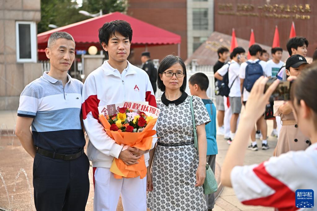 6月10日,在北京人大附中考點(diǎn),考生與父母合影。