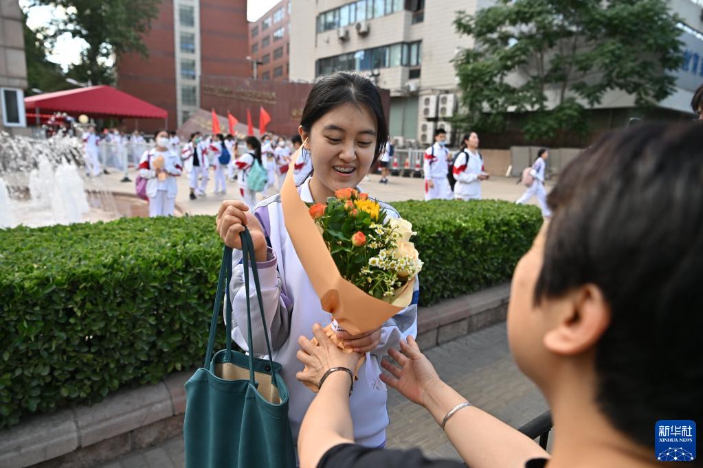 6月10日,在北京人大附中考點(diǎn),一名考生接到母親送的花束。