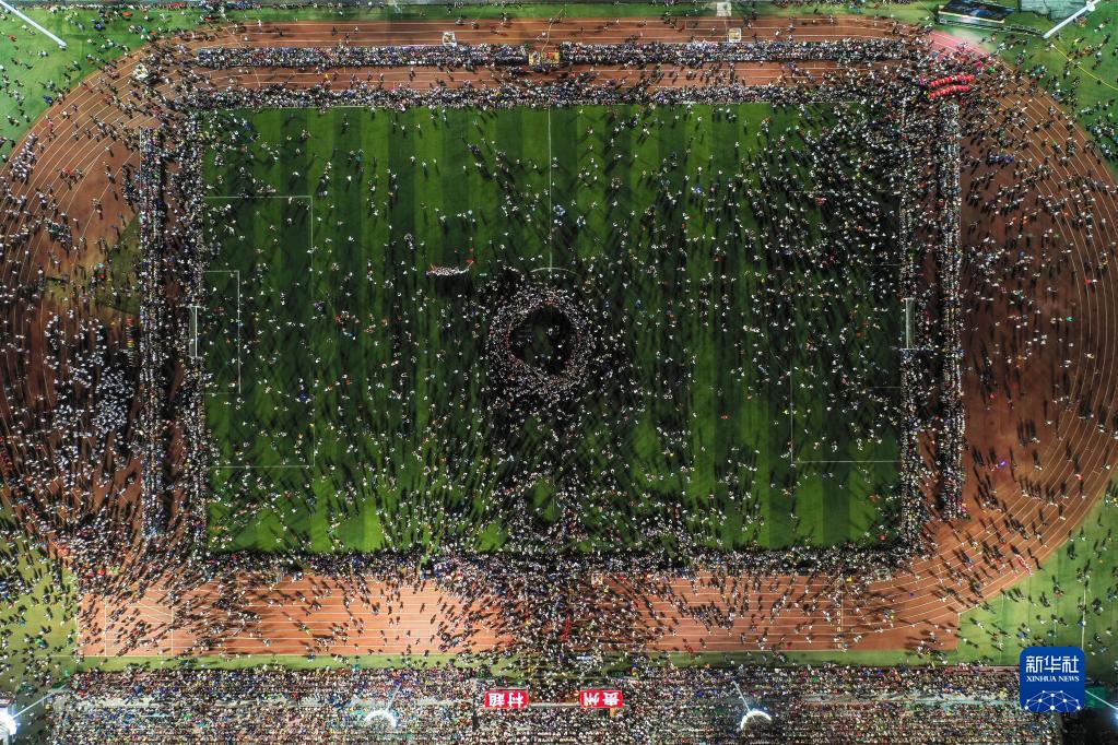 6月10日,演員在貴州“村超”足球比賽后表演民族舞蹈“多耶”,現場(chǎng)觀(guān)眾一起上場(chǎng)狂歡(無(wú)人機照片)。