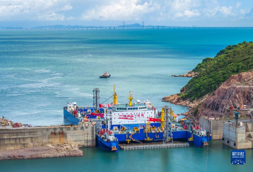 “一航津安1”號沉管運輸安裝一體船拖帶E23管節和最終接頭從珠海桂山島啟航,前往沉放水域(6月8日攝,無(wú)人機照片)。