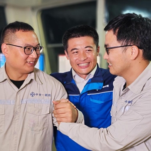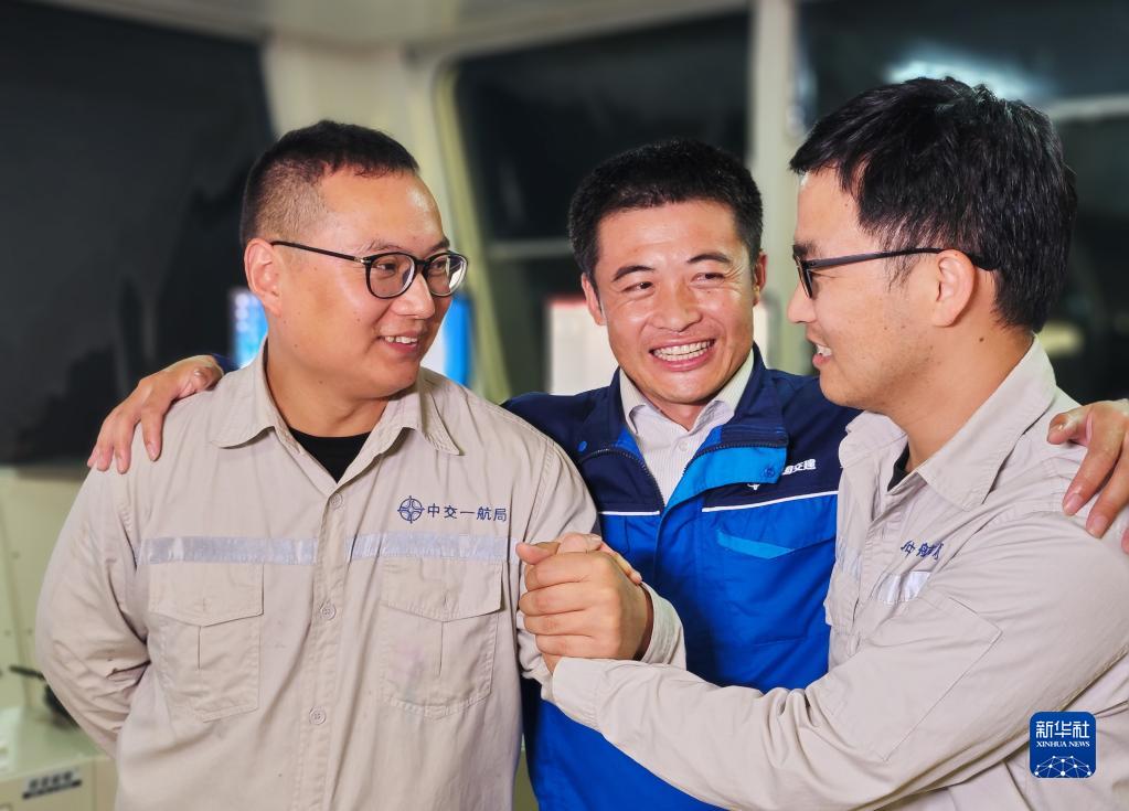在深中通道海底隧道管節最終接頭合龍后,鎖旭宏(中)和團隊成員慶賀(2023年6月11日)。