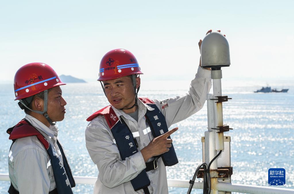 鎖旭宏(右)指導隊友檢查“一航津安1”號沉管運輸安裝一體船上的北斗衛星數據接收設備(2022年7月22日攝)。
