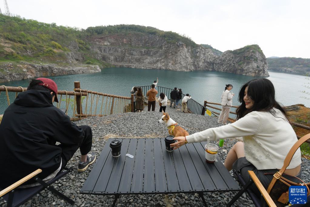 游客在浙江湖州市安吉縣梅溪鎮紅廟村一家建于廢棄礦坑旁的咖啡館休閑(4月7日攝)。