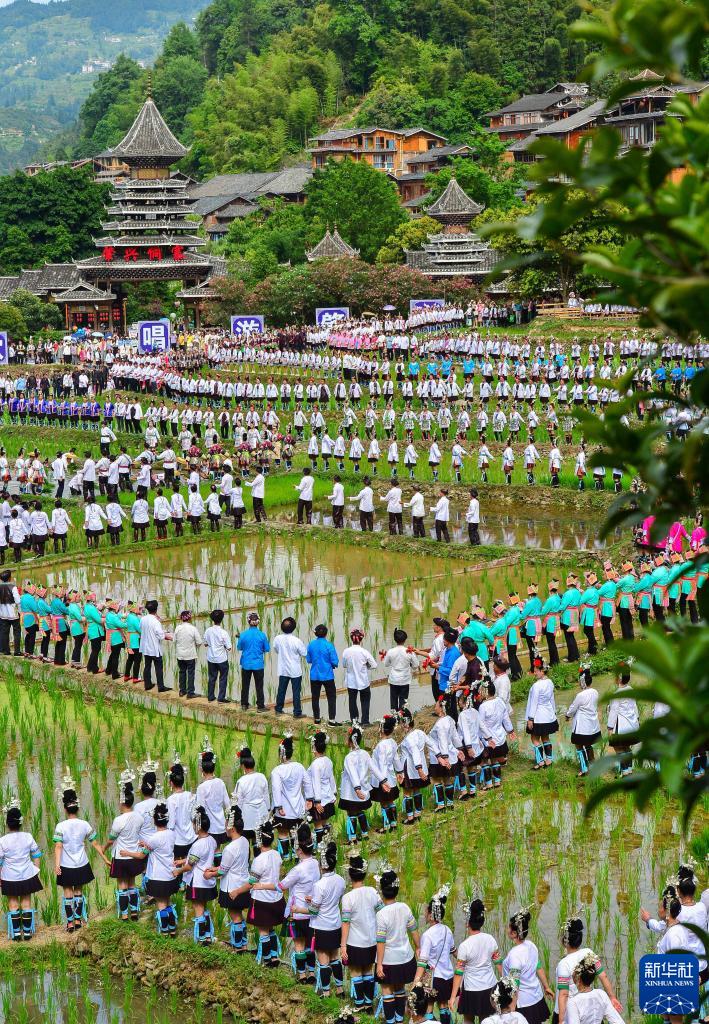 6月10日,在貴州省黔東南苗族侗族自治州黎平縣肇興侗寨,以侗寨作背景,以田園為舞臺,來(lái)自黔東南州各縣市的歌手與現場(chǎng)游客、群眾約萬(wàn)人合唱侗族大歌等歌曲,展示人類(lèi)非物質(zhì)文化遺產(chǎn)之美。