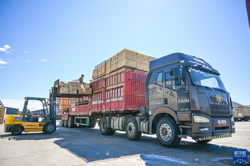 6月11日,工人在二連浩特口岸旁的進(jìn)出口物流園區中裝載準備出口的貨物。