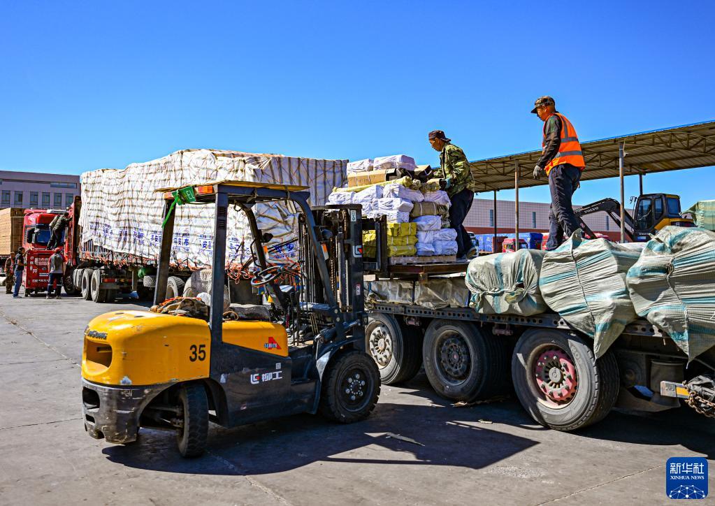 6月11日,工人在二連浩特口岸旁的進(jìn)出口物流園區中裝載準備出口的貨物。