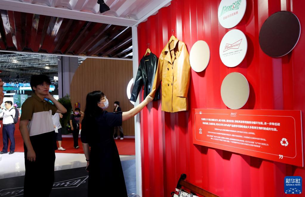 6月11日,參觀(guān)者在博覽會(huì )現場(chǎng)用手觸摸一件使用廢酒糟為原料制作的植物基皮革服裝。