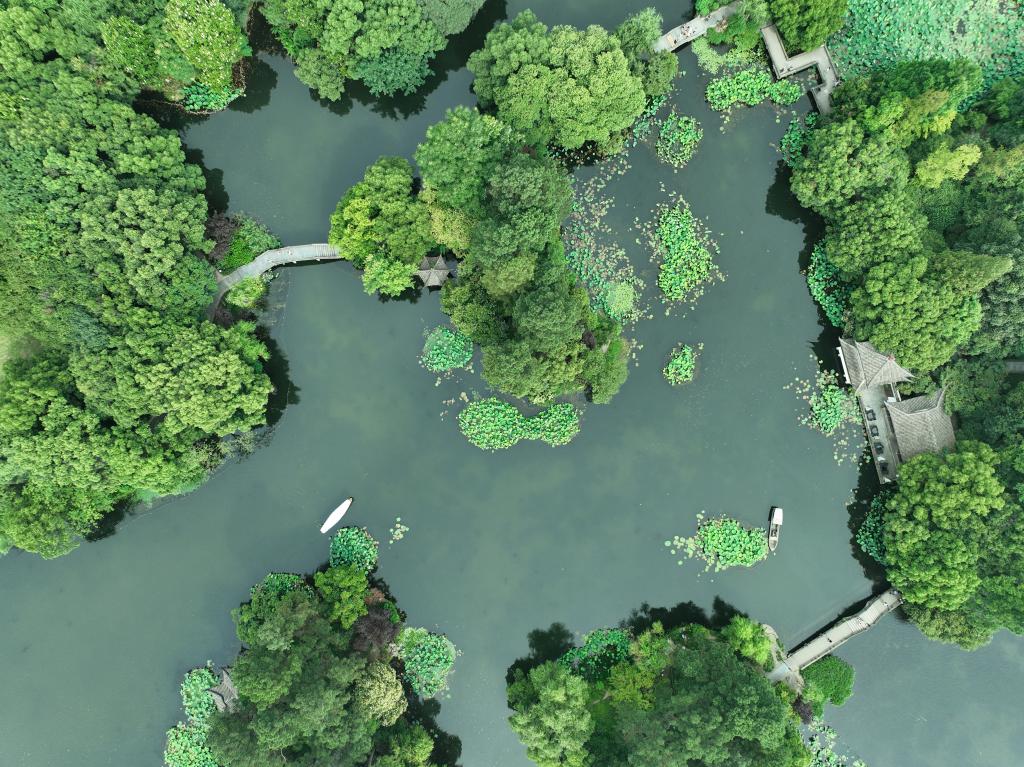 6月11日,游客在曲院風(fēng)荷景區欣賞荷花(無(wú)人機照片)。
