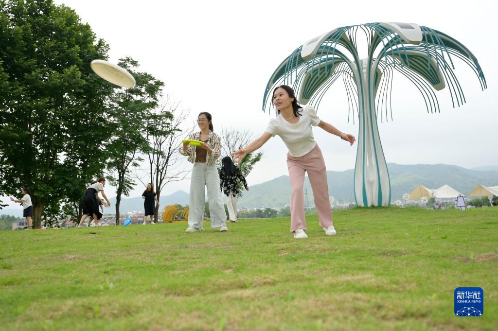 6月5日,在浙江省湖州市安吉縣天荒坪鎮余村鄉村圖書(shū)館前,年輕人在草坪上玩飛盤(pán)。