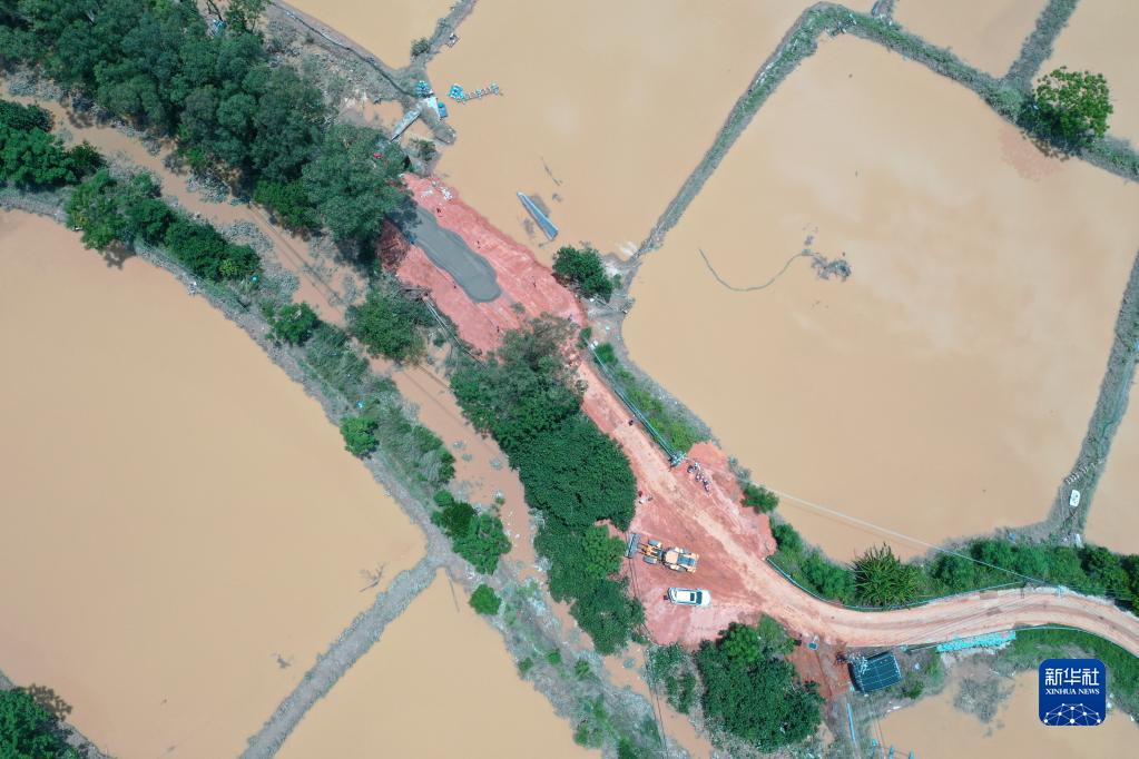 6月11日,在廣西合浦縣白沙鎮,工人在施工修復遭洪水損毀的堤壩(無(wú)人機照片)。