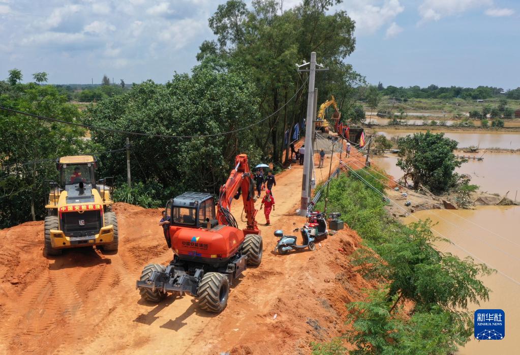 6月11日,在廣西合浦縣白沙鎮,工人在施工修復遭洪水損毀的堤壩(無(wú)人機照片)。